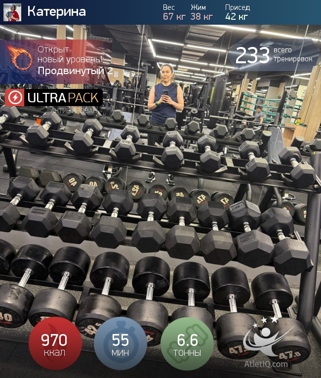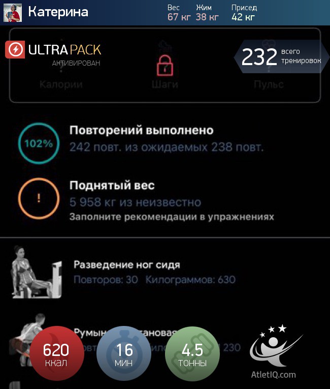 "I want to become giant!" With this thought you fall asleep and wake up, but the universe does not hurry to fulfill your wishes! No wonder: autosuggestion, of course is powerful thing, but workouts in the gym are much more effective. You can see this on your personal experience, having experienced a super-voluminous dumbbell program from AtletIQ!Goal: