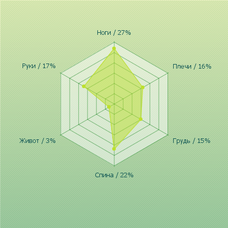 На этом графике представлена информация о том, как будет меняться интенсивность тренировок программы, и какой вклад в общую нагрузку будет вносить каждое из упражнений. Иными словами, вы можете оценить, какие тренировки будут легче, какие — тяжелее.